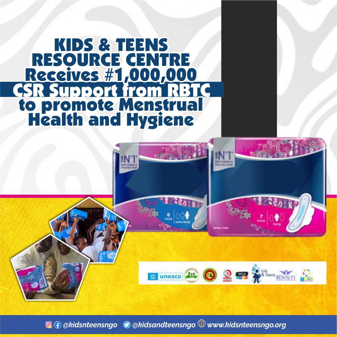 Kids & Teens Resource Centre (K&TRC) has received a ₦1,000,000 support from Royalty Business and Travels Consult (RBTC) to promote menstrual health and hygiene among adolescent girls in Nigeria.